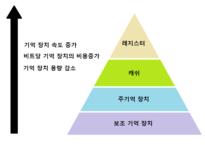 메모리 계층 구조(Memory Hierarchy)는 여러가지 기억장치를 필요에 따라 속도, 용량, 성능에 따라 계층적으로 나누어 둔 것을 의미함. 하위 계층으로 갈수록 용량이 늘어나고 가격이 저렴하지만 속도가 느리며 상위계층으로 갈수록 용량이 작고 가격이 비쌈 이를 보완하기 위해 메모리 계층 구조를 사용함