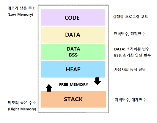 언어별로 차이는 존재하지만메모리는 크게 4가지 영역(Code, Data, Heap, Stack)으로 나뉘어져 있음