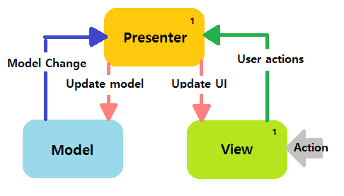 MVC와 유사한 디자인 패턴으로 MVC에서 Controller가 하는 역할을 Presenter가 함