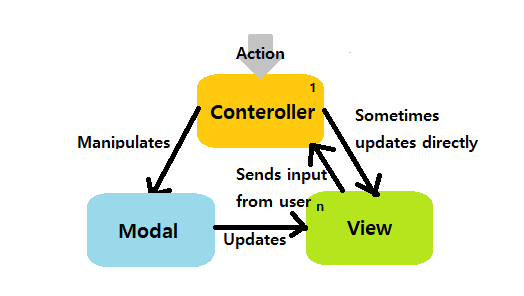- 사용자의 요청(Action)이 Controller에 들어옴