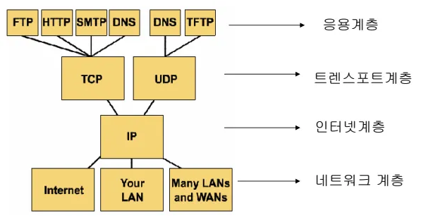인터넷 프로토콜 스택은 OSI 7계층과 달리, 4계층 (또는 5계층) 으로 구분