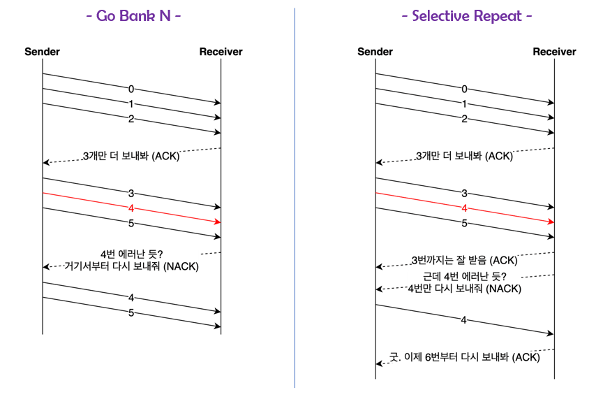 - Selective Repeat 기법: 에러난 데이터만 재전송하고 그전에 받았던 순서가 잘못된 데이터 버퍼를 재정렬하여 제어