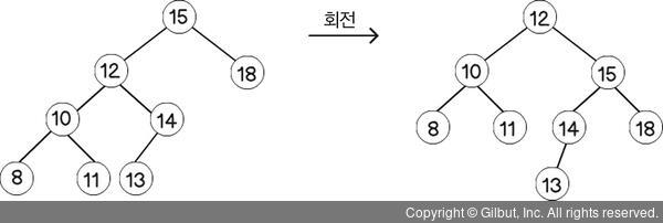 - 삽입, 삭제를 할 때마다 균형이 안 맞는 것을 맞추기 위해 트리 일부를 왼쪽 혹은 오른쪽으로 회전(rotation)시키며 균형을 잡음
