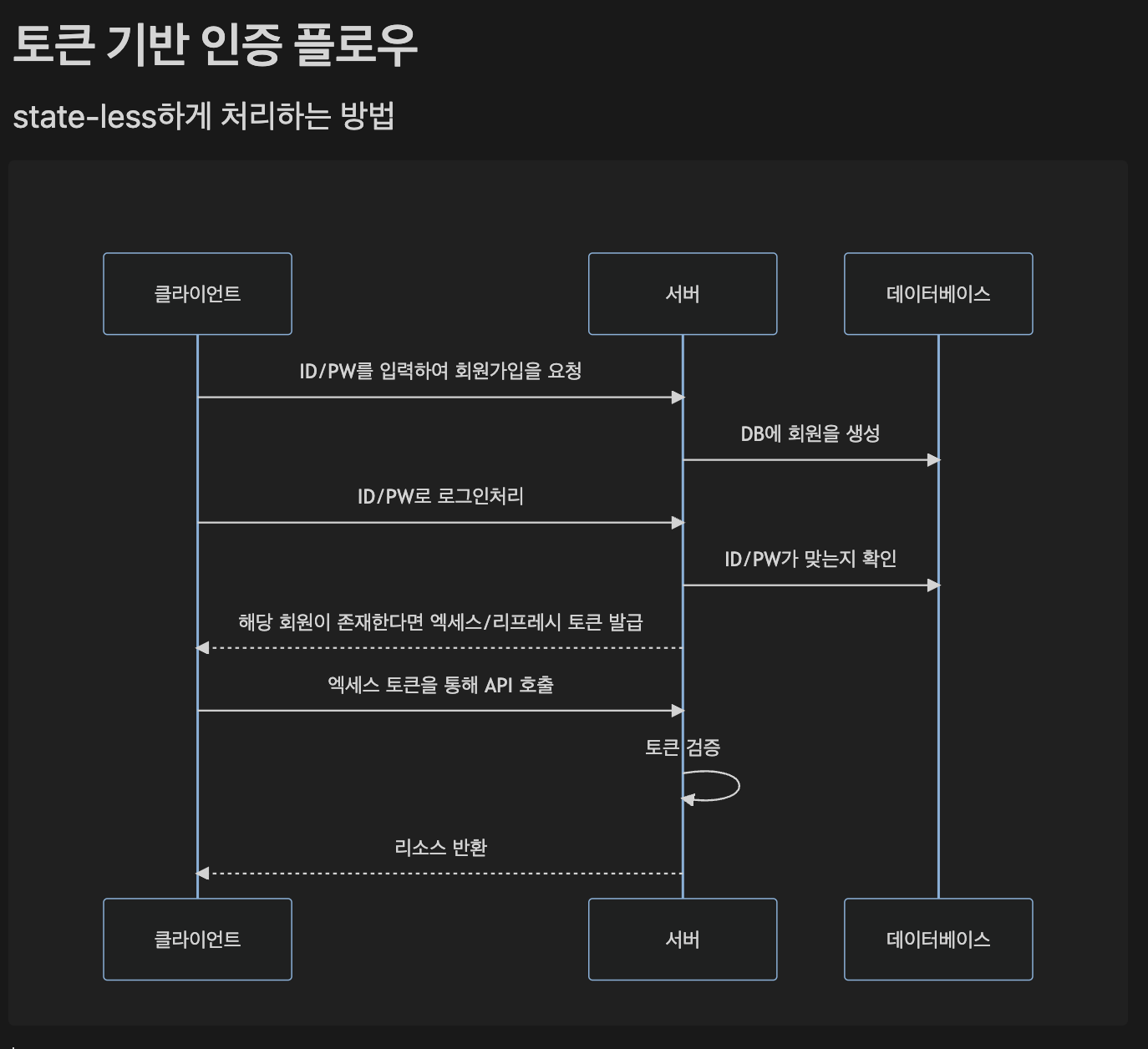 - 클라이언트가 ID, PW로 서버에게 인증을 요청하고 서버는 이를 확인하여 Access Token과 Refresh Token을 발급