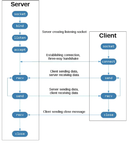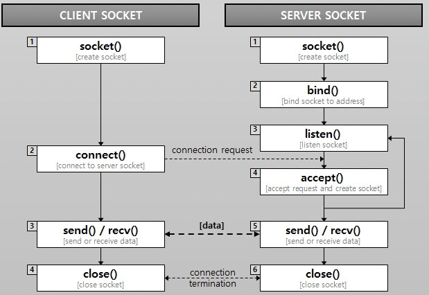 소켓은 클라이언트 소켓과 서버 소켓으로 구분되며, 소켓간 통신을 위해서는 네트워크상에서 클라이언트와 서버에 해당되는 컴퓨터를 식별하기 위한 IP주소와 해당 컴퓨터내에서 현재 통신에 사용되는 응용프로그램을 식별하기 위한 포트번호가 사용됨