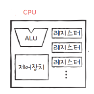내부 구성은 크게 산술/논리 연상 장치(ALU), 제어 장치와 레지스터로 구성되어 있음