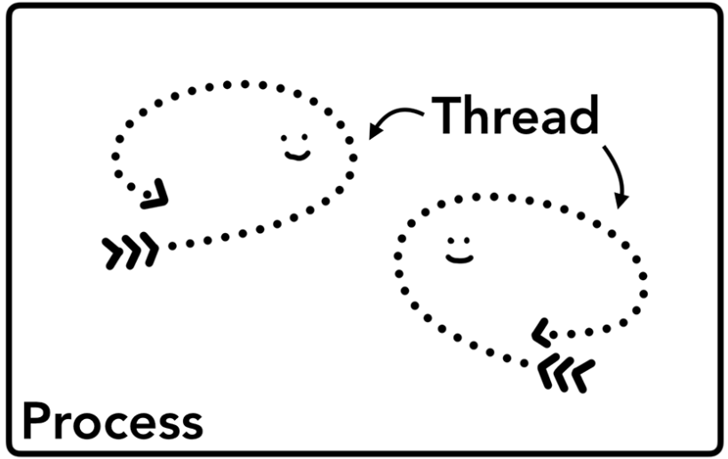 스레드는 프로세스 내부에 있으며 프로세스로 실행되는 프로그램의 일부를 실행
