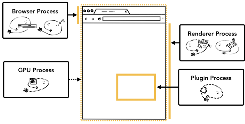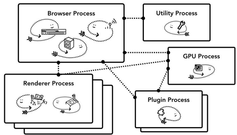 제일 위에 있는 브라우저 프로세스는 애플리케이션의 각 부분을 맡고 있는 다른 프로세스를 조정함