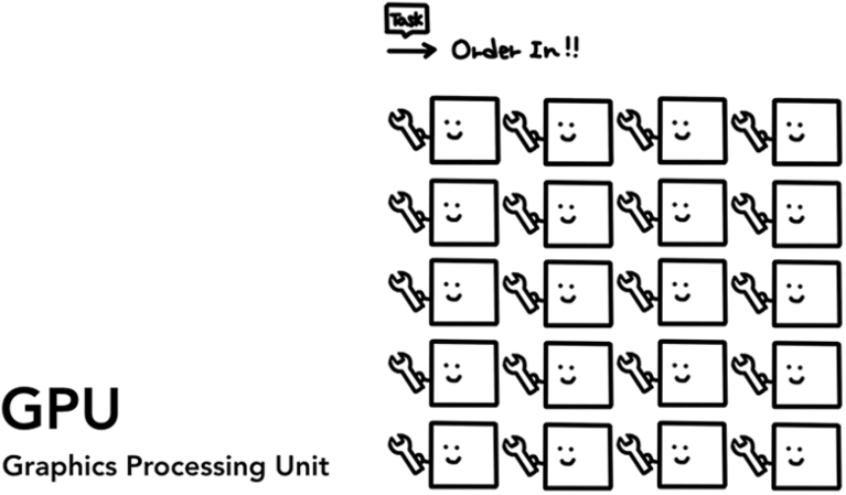 CPU와 달리 GPU는 간단한 작업에만 특화되어 있지만 여러 GPU 코어가 동시에 작업을 수행할 수 있음