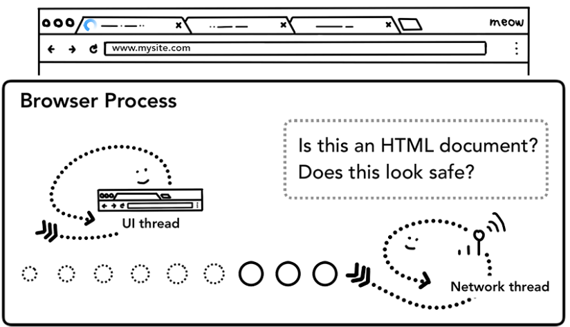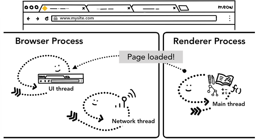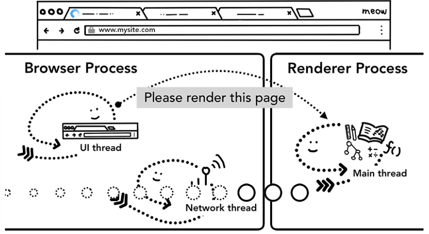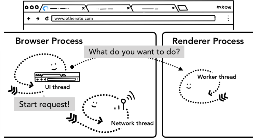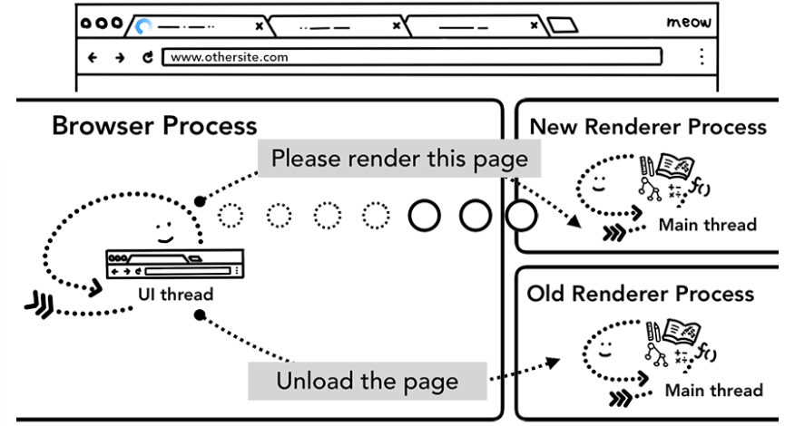 JavaScript 코드를 포함해 탭 안의 모든 것은 렌더러 프로세스에 의해 처리되므로 브라우저 프로세스는 새로운 내비게이션 요청이 들어오면 현재 렌더러 프로세스를 확인해야 함