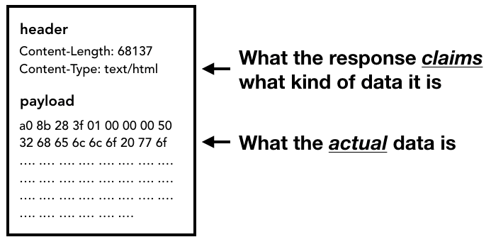 페이로드가 어떤 형식의 데이터인지는 응답 헤더의 Content-Type 헤더가 알려 주지만 정보가 없거나 잘못된 정보가 있을 수 있음 그래서 이때 MIME 스니핑(리소스를 보고 올바른 MIME 타입(파일 형식)을 추측)을 실행해 데이터의 실제 형식을 알아냄(매우 까다로운 작업이기에 브라우저가 다양한 방법으로 Content-Type 헤더와 페이로드를 처리)