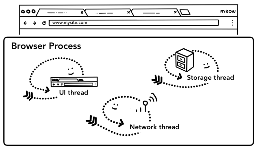 브라우저 프로세스에는 UI 스레드와 네트워크 스레드, 스토리지 스레드 등이 있음