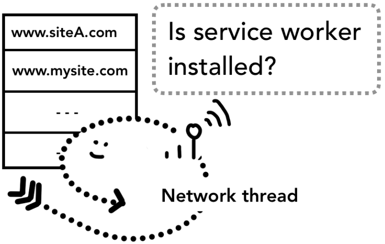 해당 URL에 등록된 서비스 워커가 있으면 UI 스레드는 서비스 워커 코드를 실행하기 위해 렌더러 프로세스를 찾음