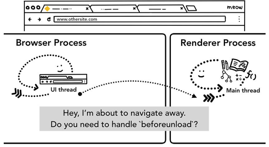사용자가 링크를 클릭하거나 클라이언트 사이드 JavaScript에서 window.location = "https://newsite.com" 코드를 실행하는 것과 같이 렌더러 프로세스에서 내비게이션이 시작되면 렌더러 프로세스는 먼저 beforeunload 이벤트 핸들러를 확인