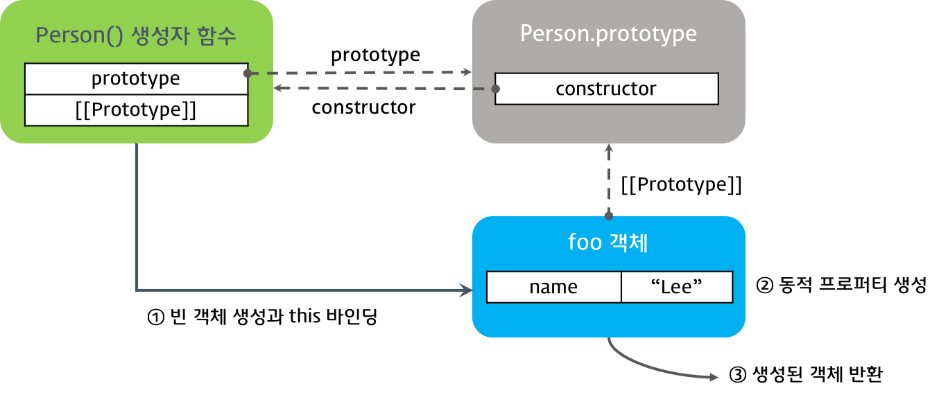 그리고 생성된 빈 객체는 생성자 함수의 prototype 프로퍼티가 가리키는 객체를 자신의 프로토타입 객체로 설정